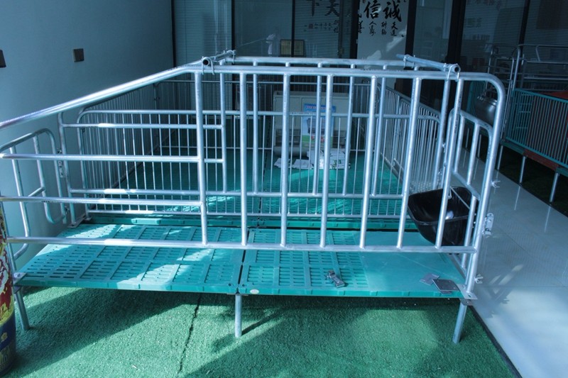 母豬產床又稱高培產仔欄,主要由母豬定位架、仔豬圍欄、仔豬保溫箱、漏糞地板、母豬食槽和小豬補料槽等組成。 母豬定位架的作用是控制母豬自由活動區域和躺臥方式,母豬產床定位架之間有擋杠,避免仔豬被壓死、踩死和壓傷。定位架的長度一般為2.1-2.3米,寬度為0.6米,高度為1.0米。限位架*下邊的一根欄桿上面焊有彎曲的檔柱,用以保護仔豬,而不影響仔豬吃奶。母豬食槽和飲水器都在定位架的前方。
